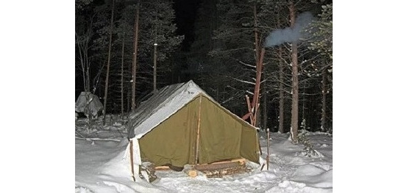 Я жил в палатке, где в задней ее половине по всей ширине были построены единые нары-настил из жердей. В передней части сбоку стояла печка с выводом труб дымохода вверх.