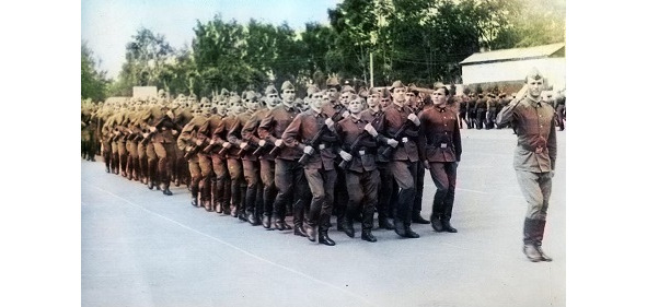 Но, наконец, нас выгрузили из вагонов и повезли в расположение части. Был поздний вечер, потихоньку стемнело, а нас построили на плацу и поскольку, видимо, не ожидали нашего приезда, продержали не нем часа два-три. Видимо, что-то не было подготовлено. Наконец всех отправили в баню и, забрав гражданскую одежду, выдали обмундирование…