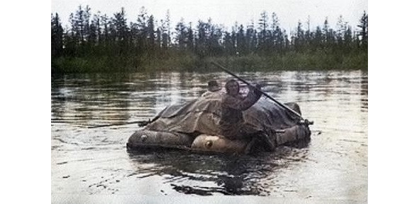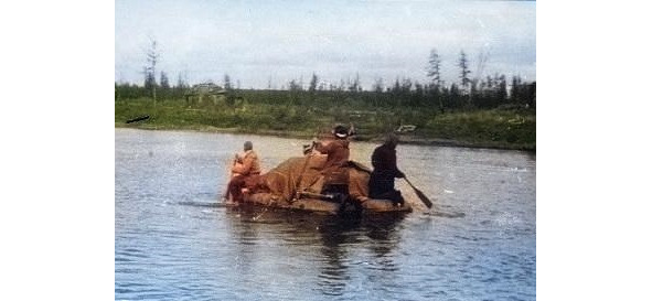 Интересна конструкция его сплавного сооружения: катамаран из двух 500-к он поставил на плот из сухих досок, к которому приделал четыре полоза-салазки (как санки). Понтоны жестко прикрепил к плоту. Таким образом увеличилась загрузка лодок, а их днища были надежно защищены от порезов на перекатах. Сооружение, конечно, довольно тяжелое и не очень хорошее для мелких рек с перекатами, но довольно остойчивое и удобное для рек с глубокими плесами.