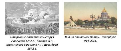 (Модель конной статуи Петра выполнена скульптором Этьеном Фальконе в 1768—1770. Голову статуи лепила ученица этого скульптора, Мари Анн Колло. Змею, по замыслу Фальконе, вылепил Фёдор Гордеев. Отливка статуи осуществлялась под руководством литейных дел мастера Екимова Василия Петровича и была закончена в 1778 году. Архитектурно-планировочные решения и общее руководство осуществлял Юрий Фельтен).