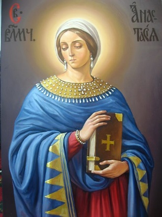 Святая великомученица Анастасия Узорешительница († ок. 304) пострадала во время правления римского императора Диоклитиана (284–305). Родилась в Риме. Отец- язычник, мать- тайная христианка. Совершила великий подвиг во имя христианской веры, о чем повествует ее Житие. Анастасия тайно пробиралась в комнаты темницы и кормила заключенных, делала перевязки их ран, умывала, ухаживала за совсем немощными. Она подвижница благочестия, облегчала участь тех, кто находился в «узах», в заключении. Она «врачеватель болезней», «избавительница от зол».