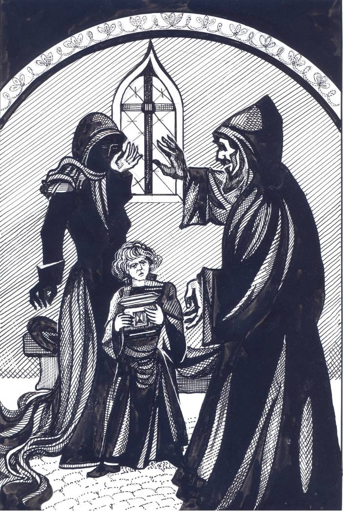 В один из августовских вечеров 1581 года в скромную каморку монаха, пристроенную к резиденции игумена, вошла женщина. На ней была просторная черная накидка с капюшоном, полностью скрывающим ее лицо. Было заметно, что она сильно устала и едва держалась на ногах. Правой рукой незнакомка крепко прижимала к себе рыжеволосого и кареглазого мальчика лет шести, одетого в черную ризу. У маленького путника в руках красовалась необычная деревянная шкатулка.