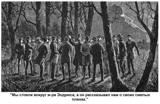 Небольшая роща мертвых и увядших деревьев, находившаяся недалеко от дороги и достаточно открытая для того, чтобы уверить нас, что нас никто не может подслушать, и являлась местом нашего совета. Никогда доселе обсуждение какого-нибудь отчаянного дела не случалось при более подходящих обстоятельствах. Буря, которая собиралась в течение всего вечер, была уже совсем рядом. Черные облака закрыли половину неба, вскоре исчезла и только-только поднявшаяся на западе молодая луна. Частые вспышки молнии, казавшиеся еще более яркими в кромешной тьме, и рокот сопровождавшего его грома, становились все сильнее и сильнее, частенько образуя невероятнейшие паузы в серьезной, но тихой речи нашего вождя. Очень необычно, что из всех этих зловещих явлений, кои так хорошо соответствовали духу нашего дела, моя память особо выделяет один – самый обычный звук – самый понятный из всех, что сопровождали эту сцену. Где-то вдалеке лаяла, а может, завывала собака – без сомнения со двора какого-нибудь фермерского дома, – может, потревоженная надвигающейся бурей, а может каким-то запоздалым путником. Популярное суеверие, вероятно, сочло бы этот звук предвестником зла, но многие из нас действительно были суеверны, несмотря на свою молодость и то, что стоя здесь в темноте, они готовились к борьбе с неведомыми опасностями.
