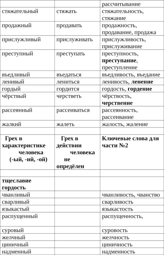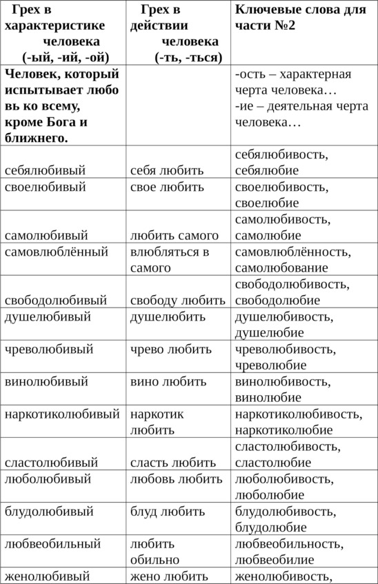 Например: слова – тщеславный, гордый, лживый, скупой, развратный и т. д. Эти слова являются носителями определённого греха.