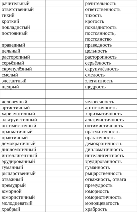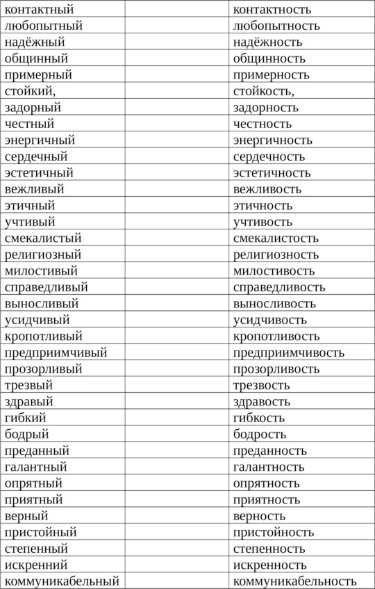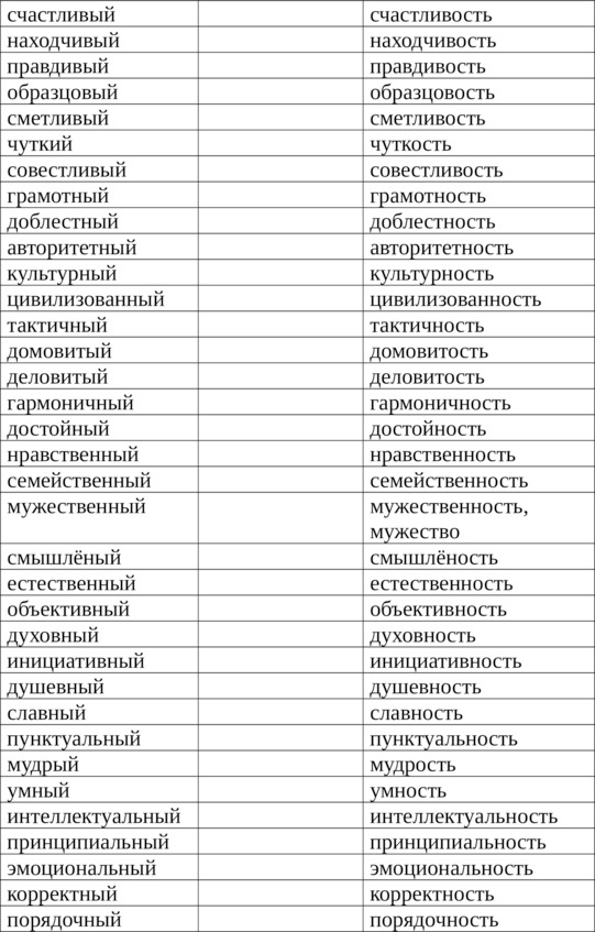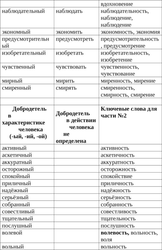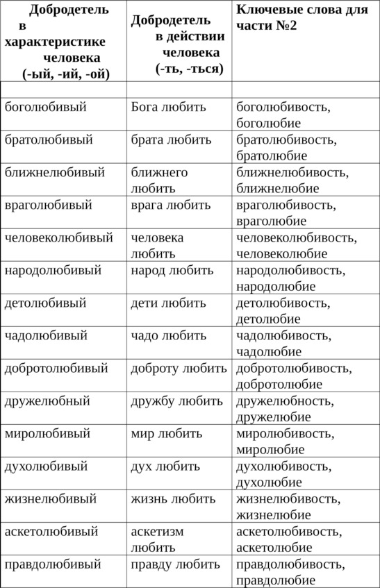 Слова – терпеливый, скромный, мирный, заботливый и т. д. Эти слова являются носителями определённой добродетели.