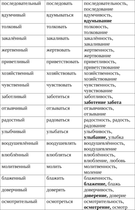 Образуются и слова, выражающие добродетель: забота – заботливый, сознание – сознательный.