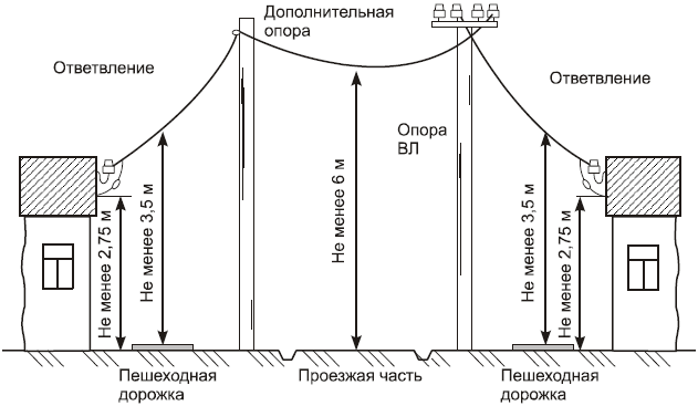 • над проезжей частью (дорогой) ВЛ должна проходить на высоте не менее 6 м;