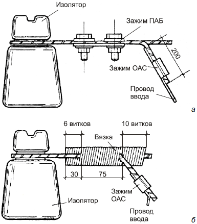 Провод ввода нельзя присоединять непосредственно к натянутому проводу ответвления, т. к. это может вызвать обрыв последнего.