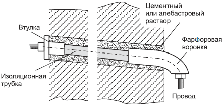 На наружные концы изоляционных трубок надевают фарфоровые воронки, на внутренние – втулки; зазоры между поверхностью отверстия в стене и изоляционной трубкой заделывают алебастровым или цементным раствором.
