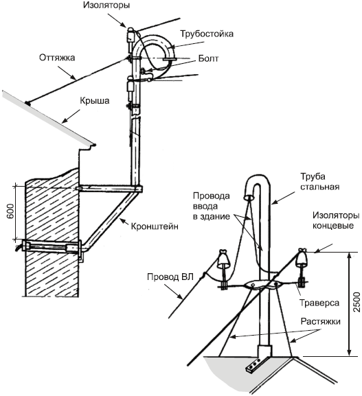 По способу прохода внутрь здания и закрепления трубостойки различают: ввод трубостойкой через стену и через крышу. На вводе от воздушной линии наличие паек недопустимо.
