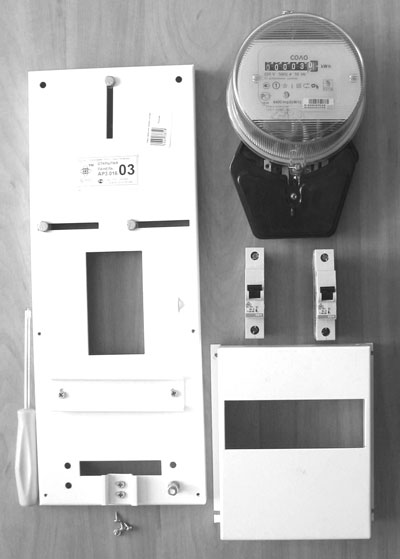 Рис. 1.17. Комплект электрощитка: металлическая панель с крышкой, электросчетчик "Соло" и два автоматических выключателя АВВ