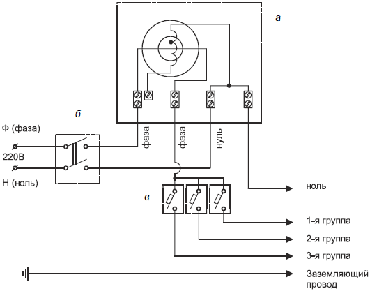 Рис. 1.18. Электрическая схема электрощитка: а – электросчетчик; б – общий рубильник; в – предохранители домовых групп (отдельных электролиний)