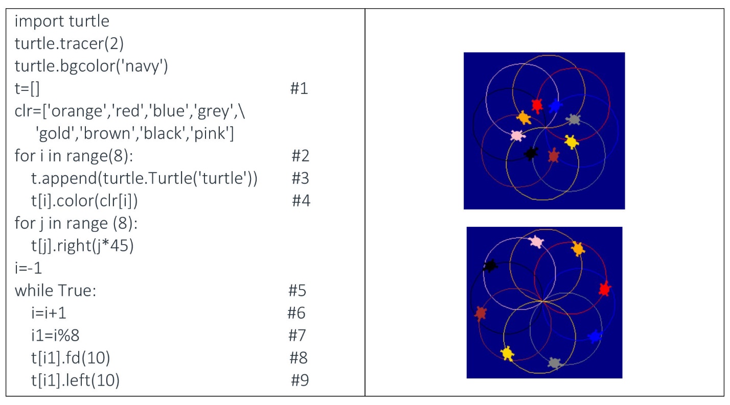 Рассмотрим подробнее коды программы. Обьекты черепашьей графики заданы в виде массива (строкa #1а). Массив пустой и заполняется с помощью цикла, введенного строками #2,#3 и #4. Получили 8 черепашьих обьектов, каждый из которых повернут относительно горизонтального положения на угол, равный 45*j, где j принимает 8 разных значений (0,1,2,3…7). Таким образом головы всех восьми черепах перед началом движения развернуты по кругу на уголы кратные 45 градусов. Бесконечное вращение каждой черепашки задается циклом в строке #8, причем величина i1 принимает только 8 возможных значений, продвигая черепаху при каждом новом заходе в бесконечном цикле на 10 единиц вперед и поворчивая ее на 10 градусов влево. Два статических кадра представленной программы показаны в правой части таблицы 11.