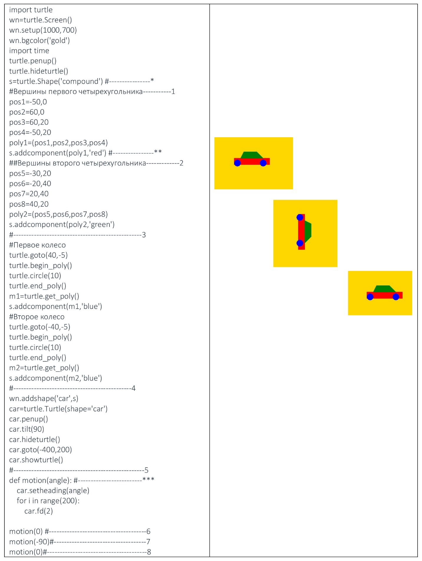 Используя указанный метод, можно построить более сложную геометрическую форму а затем применить к полученной форме все команды черепашьей графической библиотеки. Построим схематическое изображение формы автомобиля по заданным координатам вершин. Наш автомобиль будет состоять из следующих компонентов: кузов из двух полигонов (четырехугольник и трапеция), а также первое и второе колеса. Поясним коды таблицы 17. Команда, обозначенная линией с индексом *, обьявляет создание сложного обьекта, состоящего из нескольких полигонов. Первый четырехугольник (часть кузова автомобиля) задается кодами между линиями 1 и 2. Вершины первого многоугольника обозначены переменными pos1, pos2, pos3, pos4, сам полигон определяется переменной poly1. Коды между линиями 1 и 2 Строка с индексом ** добавляет первый полигон в геометрическую форму, которую мы хотим создать. Аналогично добавляется второй полигон с вершинами pos5, pos6, pos7 и pos8 (коды между линиями 2 и 3). Создав два полигона, формирующих кузов машины, добавляем первое и второе колесо с использованием кодов begin_poly() и end_poly() (коды между линиями 3 и 4). Создав автомобиль с использованием полигонов, определяем обьект car=turtle.Turtle(shape='car') с помощью черепашьей графики (коды между линиями 4 и 5). Движение автомобиля определяется строками, обозначенными индексами #6, #7, #8, через функцию(линия ***) motion с параметром angle. Несколько статических кадров полученной анимации показаны на изображениях в правой части таблицы.