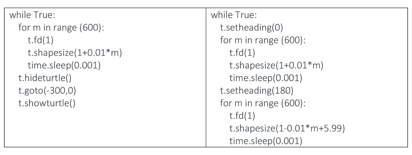 Интересный анимационный эффект может быть получен добавлением в блок команд между цифрами 3 и 4 строки t.shapesize(1+m*0.01). Соответствующий измененный блок показан ниже.