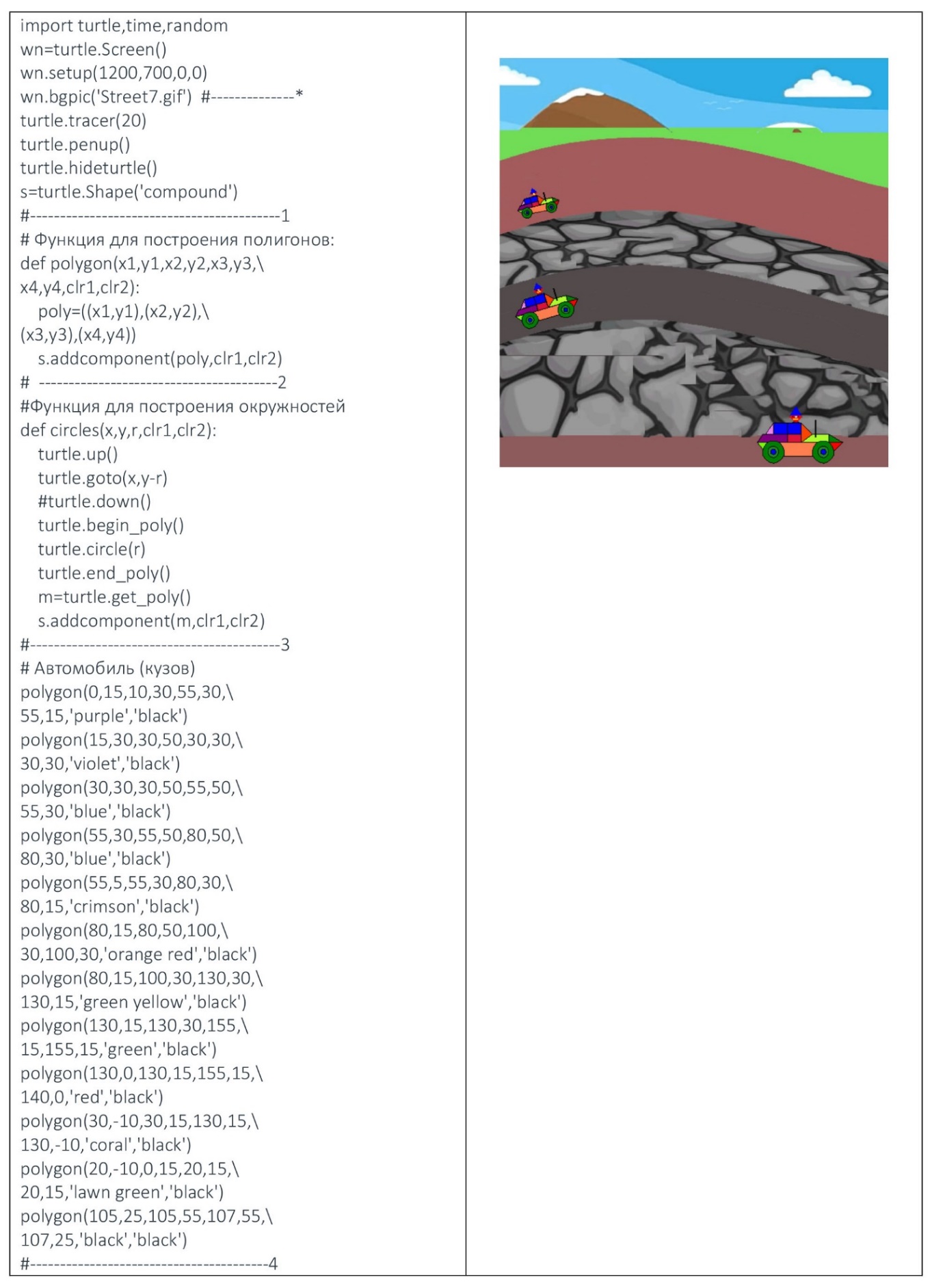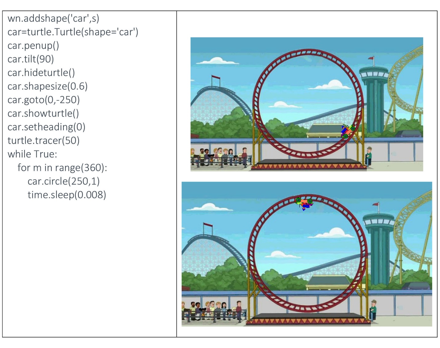 Если все блоки, начиная с линии 6 и ниже заменить на те, что представлены ниже в таблице 19, получим иной сценарий движения автомобиля (петля Нестерова или американские горки). В этом примере с помощью черепашьей графики программы Python создаем анимацию: движение автомобиля вдоль вертикальной петли. Сама петля с окружающим пейзажем введена в окно экрана файлом изображения, выбранным из интернета. Файл изображения окна следующий: Street9(4).gif. Этот файл можно скачать по адресу: