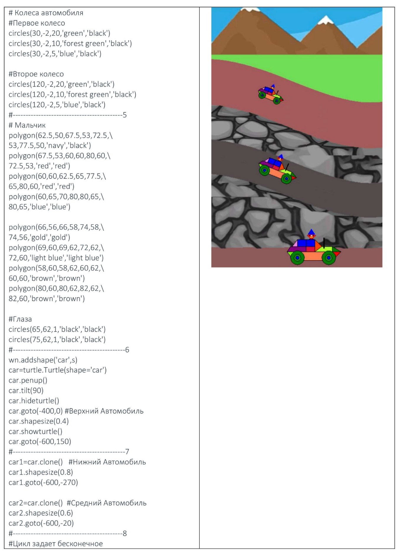Коды между линиями 3 и 4, а также между линиями 4 и 5 определяют (с использованием библиотеки черепашьей графики) необходимые обьекты, которые затем используются в программе;
