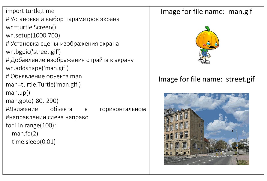 Поясним работу представленной программы. Первая строка вызывает библиотеки языка Python turtle и time, т. е. Теперь мы можем пользоваться любой командой этих библиотек. Вторая строка определяет обьект Screen (обозначили его с помощью переменной wn), далее установили размер экрана (по горизонтали 1000 пихелей, по вертикали 700 пихелей) , ввели изображение фона-улицы, а затем добавили спрайт-изображение памкина в окно экрана: файл man.gif. Затем определили обьект с именем man: (man=turtle.Turtle('man.gif')). Теперь можем применять к введенному обьекту man все команды библиотеки графической библиотеки turtle. Запустив программу, вы увидите как наш обьект-изображение скользит по экрану.