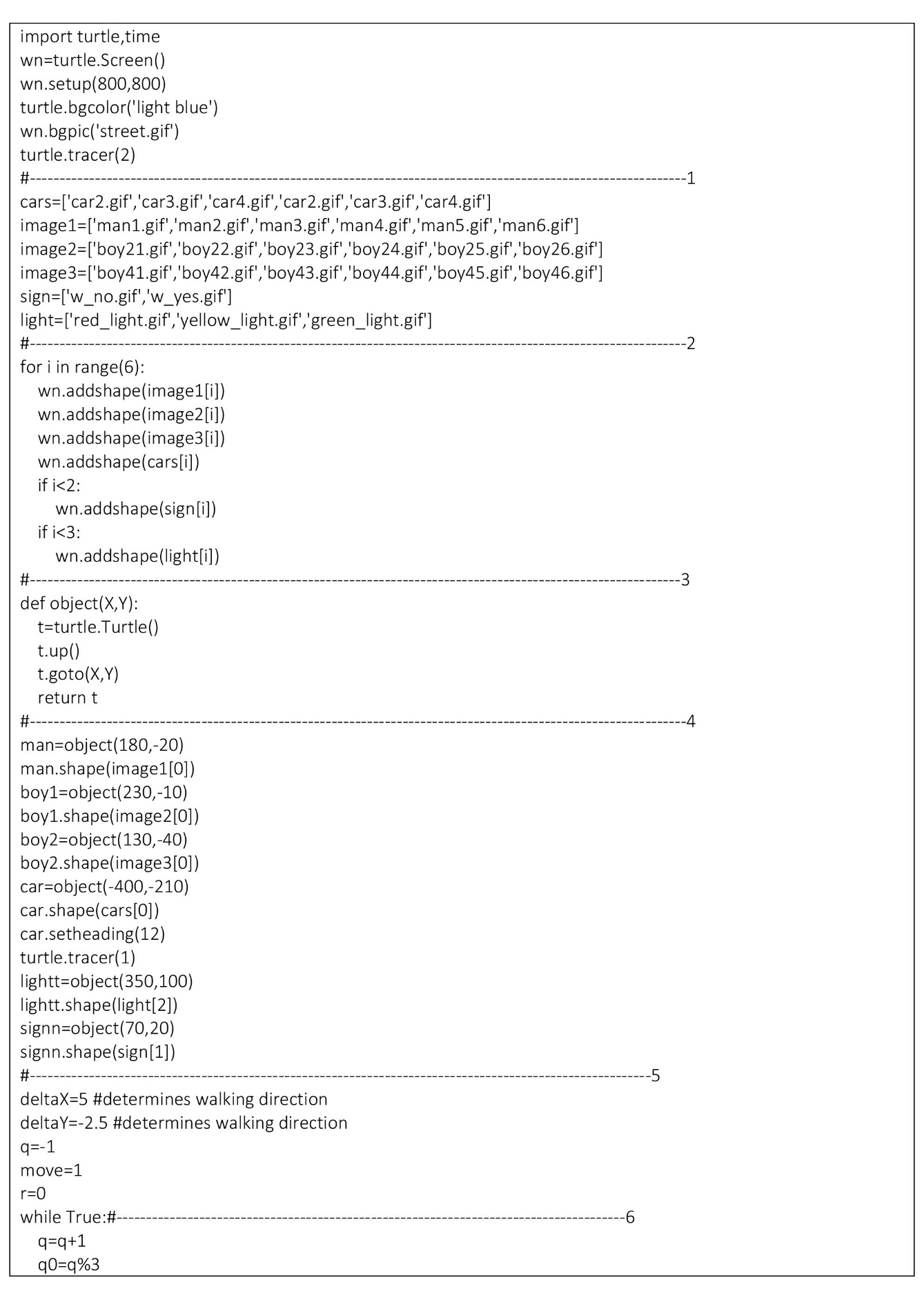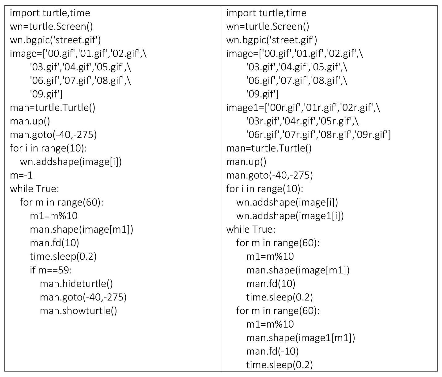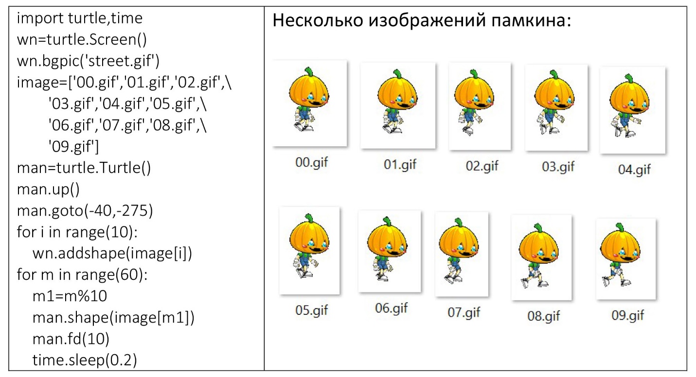 В приведенной программе 10 изображений человечка-памкина введены в программу 10-ю файлами в виде Python-list (image=[…]) и затем добавлены на экран с использованием команды wn.addshape(image[i]), где i пробегает значения от 0 до 9 включительно. Движение памкина осуществляется с помощью цикла (for m in range(60):). Целое число m1 пробегает только 10 значений ( 0,1,2…9), в то время как величина i изменяется от 0 до 60 включительно. При этом памкин проходит весь путь от левой части экрана до конца правой. Файлы с изображениями памкина, изображение улицы а также файл-программу можно скачать по адресу: