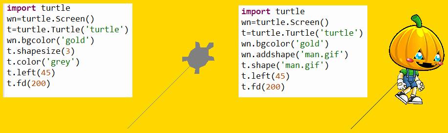Применим к встроенной в библиотеку изображению черепашки команду left(45). При этом голова черепахи повернется на 45 градусов, и последующая за ней команда fd(100) сдвинет черепаху на расстояние 100 пикселей под углом 45 к горизонту. В том случае, когда мы используем в программе изображение, добавленное командой wn.addshape(image), повернуть изображение вокруг своей оси нельзя. Но последующая за командой left(45) команда fd(100) сдвинет изображение на 100 пихелей в направлении под углом 45 градусов к горизонту также как и в случае со стандартным изображением черепахи. Аналогичное правило действует в отношении поворота вправо. На нижнем рисунке видно: слева голова черепашки повернулась при использовании команды left(45), на правом изображении памкин не повернулся на 45 градусов, однако и черепашка и памкин прошли 200 пикселей в направлении под 45 градусов к горизонтали.