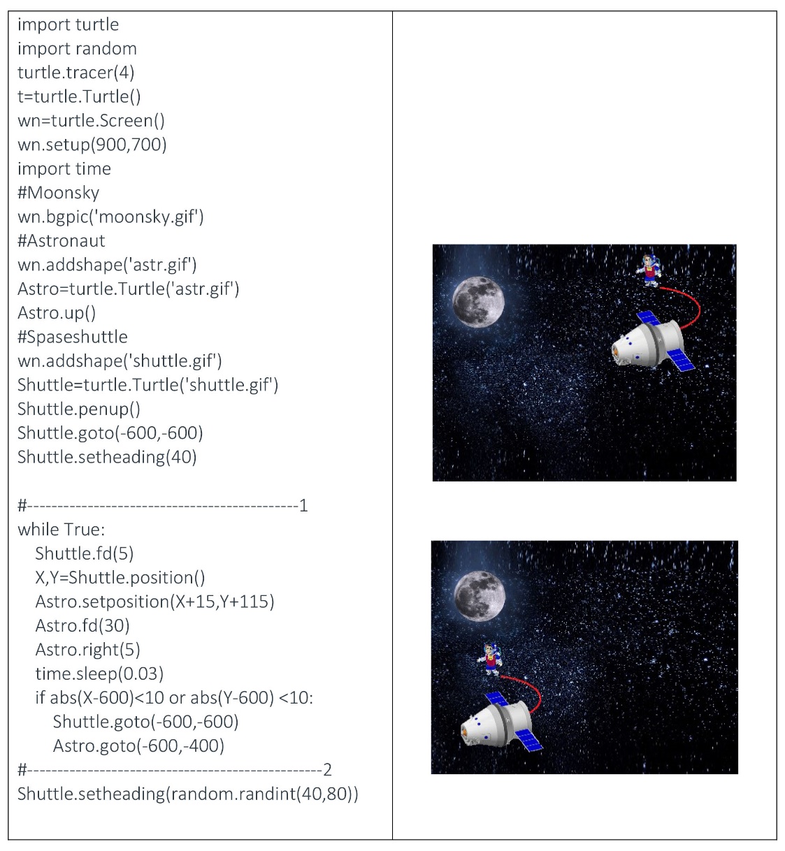 В показанном примере изображение окна экрана (звездного неба) а также астронавта и космического корабля вводятся в программу с помощью трех файлов: moonsky.gif, astr.gif и shuttle.gif. Движение корабля и космонавта определяются кодами между линиями 1 и 2, каждое новое вхождение космического корабля в зону окна задается случайным углом наклона (последняя строка кода). Для того,чтобы астронавт не удалялся от корабля, в процессе работы программы определяются координаты корабля X,Y, а затем позиция космонавта определяется строкой кода Astro.setposition(X+15,Y+115). Файлы с необходимыми изображениями а также файл с программой можно скачать по адресу: