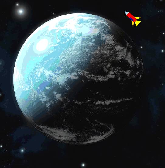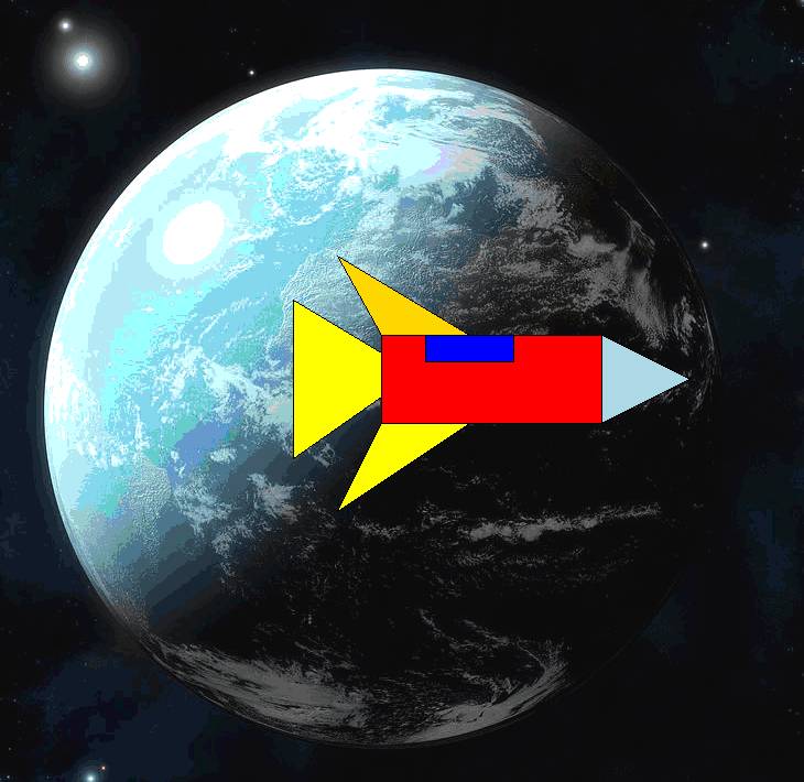 В отличие от предыдущего примера в представленном коде ракетоплан создается с использованием 6 полигонов с вершинами, обозначенными в строках #1-#6. Каждый из полигонов окрашен в свой цвет, а все вместе образуют ракетоплан, который вращается вокруг земли и подчиняется всем командам черепашьей графики. Применяя к построенному ракетоплану функции поворота(left(),right()), используемые в черепашьей графике, создаем еффект его вращения вокруг Земли. Ниже на фоне Земли показан ракетоплан, построенный с помощью полигонов кода.