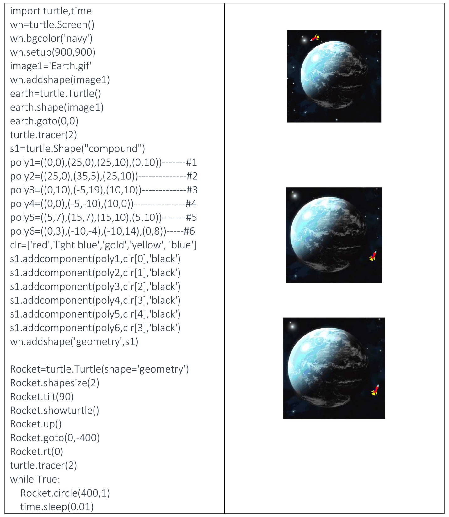 Следующий проект: ракетоплан вращается вокруг Земли. Особенностю создания программы является то, что ракетоплан строим сами, используя метод полигонов, изображение Землю выбераем из интернета. Ниже на рисунке показана статическая картина того, что мы хотим реализовать с помощью команд черепашьей графики и использованием стандартных команд программы Питон.