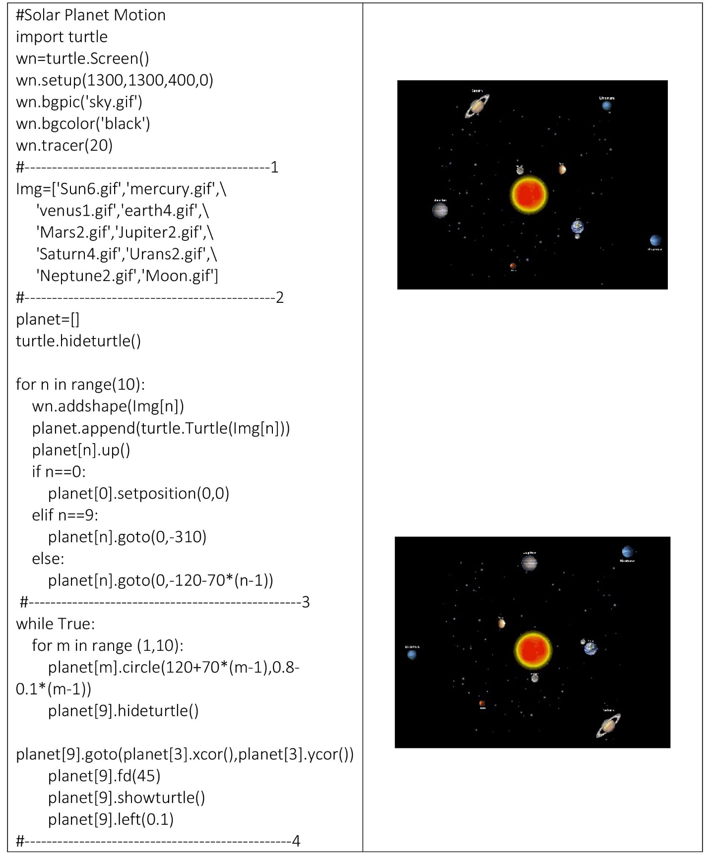 Представленная в таблице 26 программа реализует анимацию солнечной системы с использованием планет-изображений-спрайтов, скачанных из интернета, вращающихся вокруг солнца. Коротко об отдельных блоках программы. Коды с файлами между линиями 1 и 2 вводят в программу изображения планет сонечной системы. Все файлы имеют расширение gif. Между линиями 2 и 3 расположены коды, заполняющие список, в который входят указанные файлы планет. В этом же блоке коды расставляют планеты в начальное координатное положение. Наконец, коды между линиями 3 и 4 задают вращение планет викруг солнца а также луны вокруг земли.