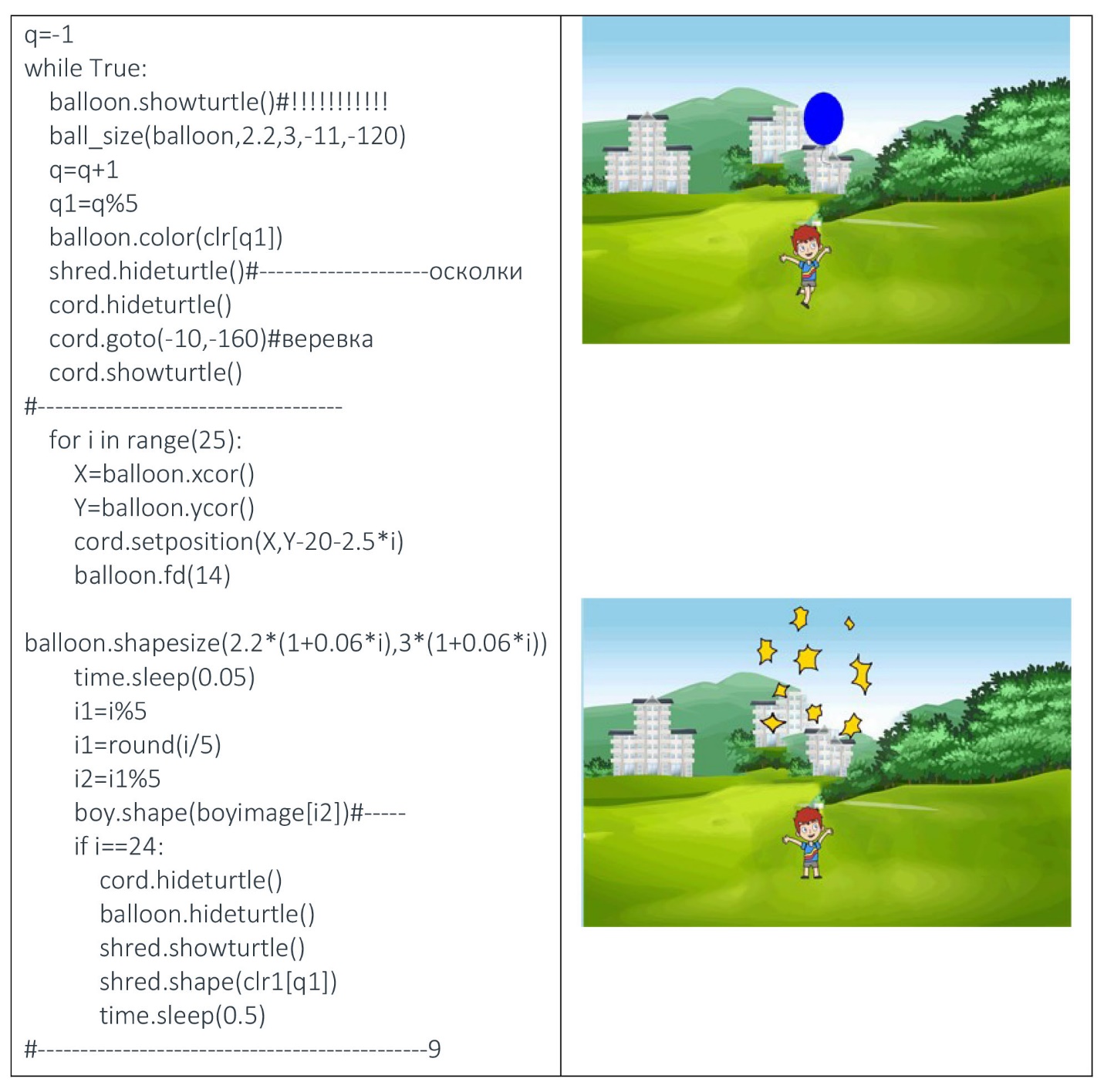 Поясним основные ключевые блоки программы. Картинка на экране, на фоне которой мальчик запускает вверх шарик, определяется файлом строки с номером 1. Между строками 2 и 3 расположены коды, задающие списки с цветами шариков а также изображения лоскутов лопнувших шариков. Между линиями 3 и 4 расположены коды, определяющие, танцующего мальчика. Коды между линиями 4 и 5 вводят в программу 5 лоскутов лопнувших шариков и изображение нитки, на которой држится шарик. Очень важными являются коды между линиями 5 и 6. Эти коды служат для определения функции, которая вводит следующие обьекты: мальчик, шарик, лоскуты лопнувшего шарика и нить, на которой держится шарик. Все 5 обьектов заданы кодами между линиями 6 и 7. Наконец, коды между линиями 8 и 9 определяют движение шарика вверх а также анимацию движений мальчика с помощью соответствующих спрайтов. Файлы изображений можно скачать поадресу: