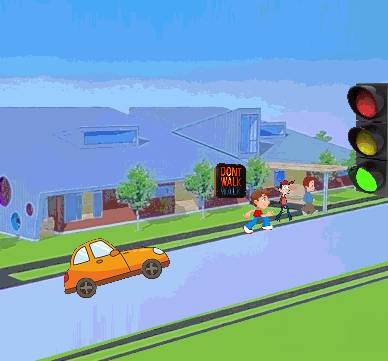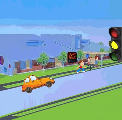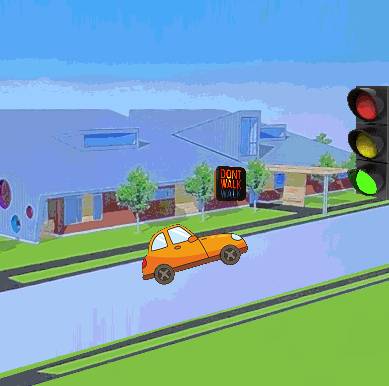 В демонстрируемом проекте участвуют несколько обьектов: три пешехода (каждый пешеход имеет 6 спрайт-изображений, отличающихся положением ног, для имитации движения); автомобиль(один спрайт); светофор с тремя спрайтами для создания переключающегося света (красный, желтый и зеленый); знак, обозначающий для пешехода необходимость переходить улицу либо стоять, когда автомобиль движется по улице (два спрайта).