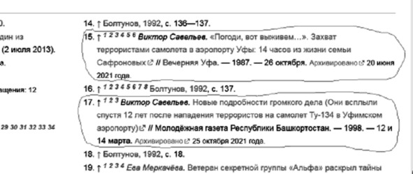 И вот что я отвечу. Готовя эту небольшую книгу о тех трагических событиях в Уфимском аэропорту, я нашел в очень популярной сетевой энциклопедии две ссылки на мои газетные публикации 1987 и 1998 годов (смотрите скриншот на следующей странице).