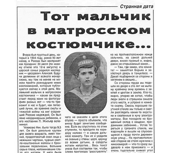 Вчера был грустный день, который в 1904 году, ровно 90 лет назад, в России был воспринят как праздник: 30 июля (по новому стилю это 12-е августа) в царской семье родился наследник – цесаревич Алексей. Будучи далёкими от всякого монархизма, мы тем не менее не можем пройти равнодушно мимо воспоминаний, которые публикуются к этой дате. Маленький мальчик в матросском костюмчике – каким он предстаёт перед нами на фотографиях разных лет – что-то тревожит в нас и будит, как погасший лучик, во времена смуты и тяжёлой войны на миг озаривший Россию надеждой. Он был явно неординарным ребенком, и его наставник П. Жильяр вспоминал:
