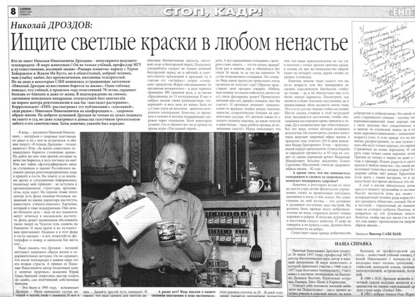 Надо сказать, что Дроздов – великий энтузиаст здорового образа жизни и оздоровительных методик. Он не скрывает, что после телепередач о живом мире это его вторая страсть. А привил ее Николаю Николаевичу автор нескольких книг о «ключах здоровья», академик Юрий Гущо, бывший спортсмен, мастер спорта по самбо, сам излечивший собственные болезни.