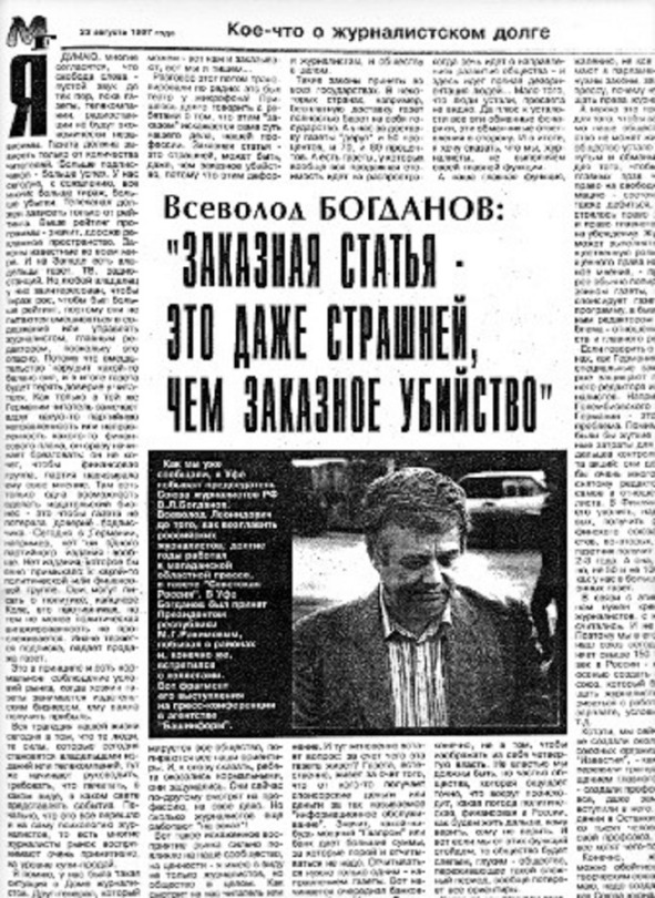 В основу публикации «Молодежной газеты» положена диктофонная запись выступления председателя Союза журналистов РФ Всеволода Леонидовича Богданова на пресс-конференции в агентстве «Башинформ» в 1997 году.