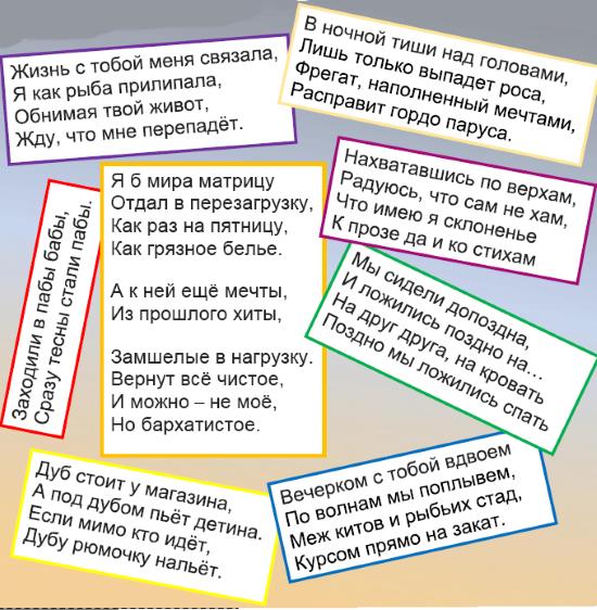 Мы сидели допоздна,И ложились поздно на…На друг друга, на кроватьПоздно мы ложились спатьДуб стоит у магазина,А под дубом пьёт дитина.Если мимо кто идёт,Дубу рюмочку нальёт.Вечером с тобой вдвоёмПо волнам мы поплывём,Меж китов и рыбных стад,Курсом прямо на закат.