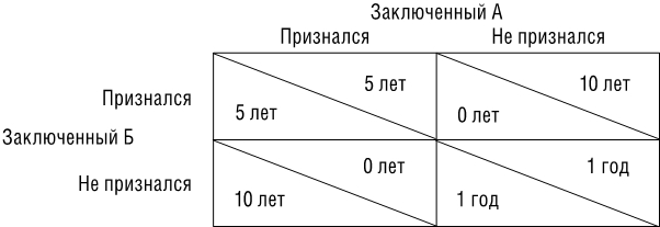 В каждой ячейке число над диагональю – приговор заключенного А. если оба подозреваемых признаются, то каждый из них получит по пять лет. Если не признается ни один, то оба получат по одному году.
