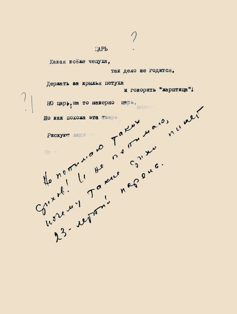 Какая всё же чепуха,Нет-нет, так – не годится —Держать за крылья петухаИ говорить – жар-птица!Но царь на то, наверно, царь.Подальше – от греха…Но как похожа эта тварьУ нас на петуха?!Рискуют люди головой:Хоть ты и царь – шалишь,Но только правду под полойОт нас не утаишь.А царь всю ночь опять не спал,Томился от досады —Он птицу счастья людям дал,Чего ещё им надо?!
