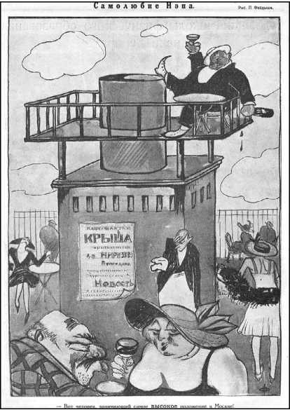 Карикатура. Журнал «Прожектор», 1923 г. Подпись: «Вот человек, занимающий самое ВЫСОКОЕ положение в Москве!»