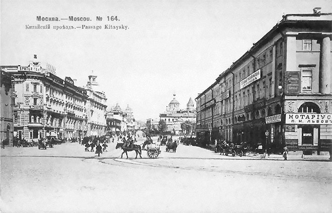 Театральный проезд в сторону Лубянской площади. Открытка конца XIX века из коллекции Алексея Рябова. Гостиница «Метрополь» до перестройки. Впереди видна часть Китайгородской стены, а за ней – купол Пантелеймоновской часовни и шатёр Владимирской башни