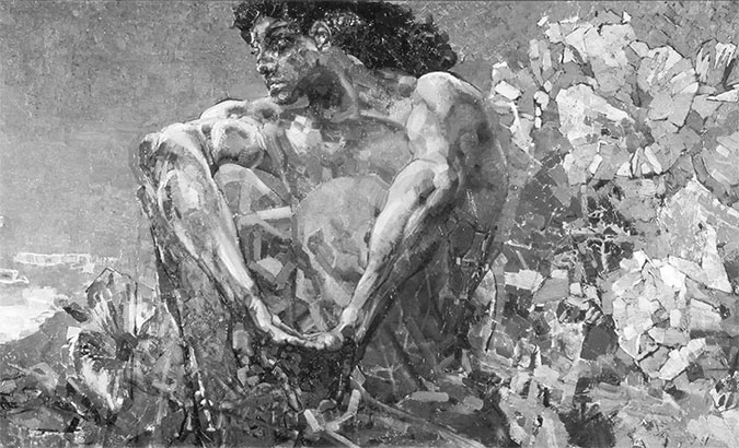 Художник покрывал холст крупными мазками, и мозаика цветовых пятен складывалась в нечто, напоминавшее не то фантастические цветы, не то громадные кристаллы… Потом в центре картины стала проявляться фигура смуглого юноши, сидевшего в печальной задумчивости, как-то странно сцепив руки. Юноша был загадочен и прекрасен, и хотелось всмотреться в его лицо, но оно оставалось в тени.