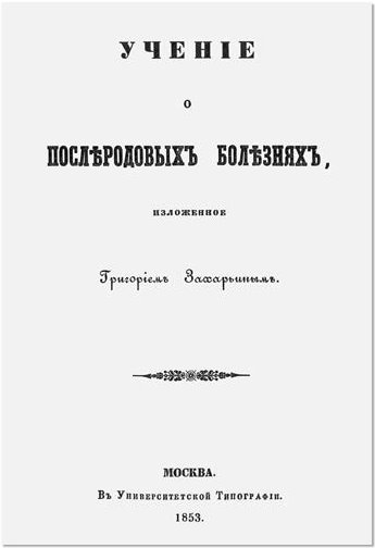 Когда томительное ожидание резолюции высокого начальства закончилось, и Захарьин получил наконец и место в клинике, и казённую квартиру, и первое жалованье в размере двухсот рублей серебром в год, настала пора срочной подготовки докторской диссертации. В 1853 году девяностостраничный опус «Учение о послеродовых болезнях, изложенное Григорием Захарьиным» вышел в свет на русском языке с посвящением достопочтенному дяде Родиону Гейману.