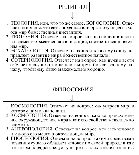 Китае, и всюду философия была частью религиозного знания. Поэтому мы вправе сказать, что философию как науку создали древние греки. В этом, конечно, нужно признать их огромную заслугу перед человечеством. Рождение научной философии было связано с её отказом пользоваться таким источником информации о сущем, как Откровение. Новая методология привела возникшую науку к новой структуризации: в ней появились разделы, которых в религии не было, а некоторые из тех, что были, теперь выпали. Структурное различие религиозного и философского познания иллюстрируется приведённой схемой.