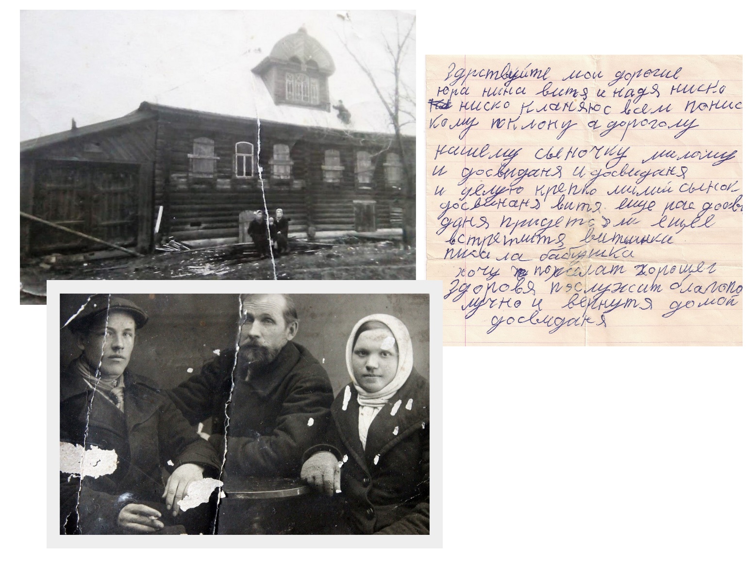 «Здравствуйте мои дорогие Юра, Нина, Витя и Надя. Низко, низко кланяюсь. Всем по низкому поклону, а дорогому нашему сыночку милому и до свидания, и до свидания, целую крепко милый сынок, и до свидания Витя. Еще раз до свидания. Придется ли еще встретиться Витенька. Писала бабушка. Хочу пожелать хорошего здоровья, послужить благополучно и вернуться домой. До свидания».