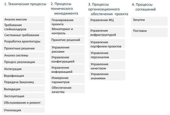 В стандарте «Процессы жизненного цикла систем» ISO 15288:2015 (ГОСТ Р 57193—2016) перечислены 30 базовых процессов жизненного цикла систем (рис. 1.2).