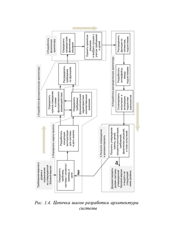 Процесс разработки верхнего уровня архитектуры системы показан на рис. 1.4. Процесс движется из верхнего левого угла по часовой стрелке. Этапы на схеме пронумерованы.