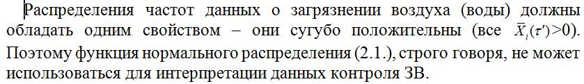 Так как значения ПДК для многих ЗВ весьма малы и находятся на границе чувствительности многих методов и приборов, ошибки измерений резко возрастают. Возможность появления больших средних квадратичных отклонений данных измерений, не зависимо от причин их генерирующих, и как следствие появление больших ошибок вычисления средних (больших 100%) приводит к необходимости использования несимметричных доверительных интервалов и несимметричных функций распределения вероятности.