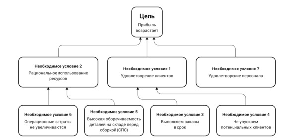 Такую диаграмму будем называть Картой промежуточных целей. Она нам напоминает, какие необходимые условия по нашим представлениям необходимо обеспечить, чтобы наша цель реализовалась.