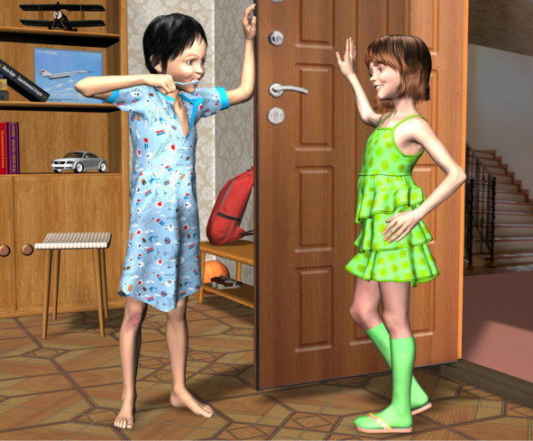 Щелкнул замок, дверь открылась. В прихожую влетела девочка в легком платьице. Она удивленно уставилась на стоящего перед ней всё ещё в рубашке мальчишку с торчащей изо рта зубной щеткой.