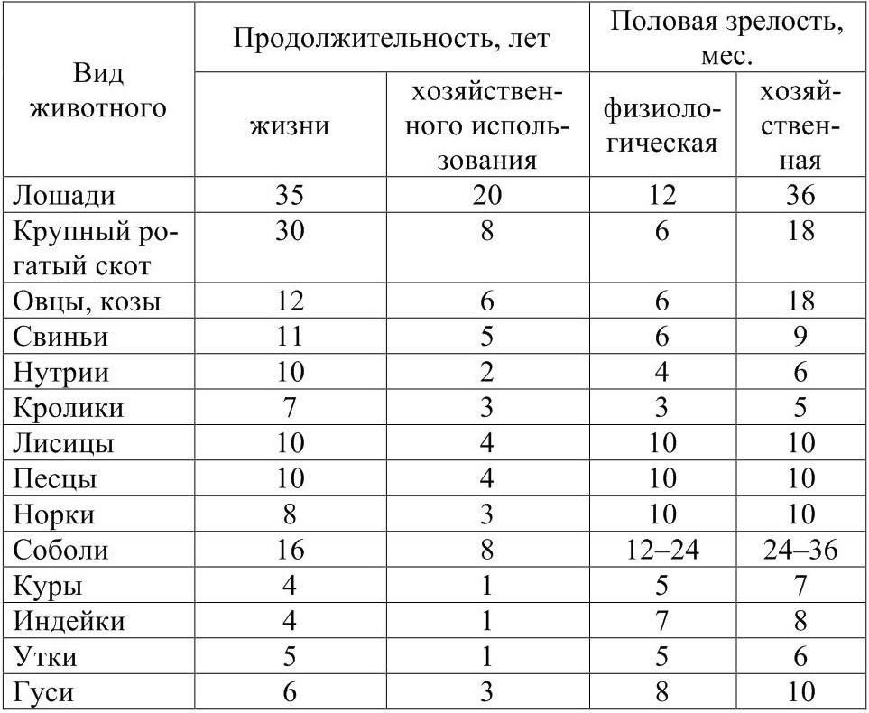 Таблица 1 – Средний возраст жизни, хозяйственного использования и достижение половой зрелости сельскохозяйственных животных