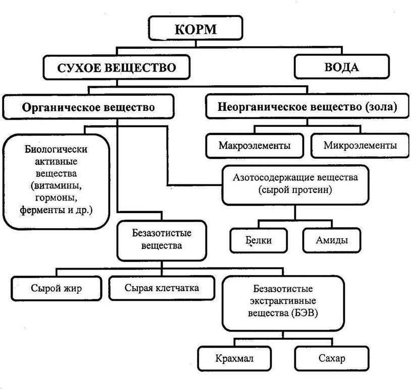 В соответствии с принятой схемой зоотехнического анализа, в кормах определяют шесть групп веществ: воду, сырую золу, сырой протеин, сырой жир, сырую клетчатку и безазотистые экстрактивные вещества (рисунок 1).